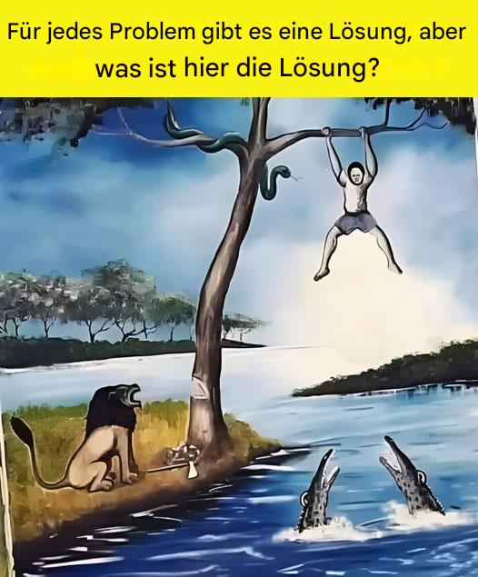 Wenn der Mann nach rechts geht, wird er von der Schlange gebissen. Geht er nach links, bricht der Baum und fällt ins Wasser. Versucht er, über den Boden zu springen, wird er vom Löwen gefressen, und fällt er ins Wasser, warten die Krokodile auf ihn. Die Situation scheint aussichtslos, aber es gibt eine Lösung. Können Sie dieses Problem für ihn lösen? Manchmal haben die Rätsel eine sehr einfache Antwort, und manchmal muss man kreativ werden. Hier ist die Lösung dieses Rätsels: Der Mensch muss warten, bis der Löwe herunterkommt, um aus dem See zu trinken und so die Krokodile abzulenken. Während der Löwe weggeht, um zu trinken, kann er sich einschleichen und entkommen.