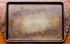 Um stark verschmutzte Backbleche zu reinigen und zu entfernen, denken Sie daran, sie zu reinigen, während der Ofen noch etwas heiß ist. Dies hilft, verbrannten Schmutz leicht zu entfetten. Denken Sie idealerweise daran, Ihre Öfen nach jedem Gebrauch mit etwas Essig, Seifenwasser, Tonstein oder Zitronensaft zu reinigen! Das Bürsten des Backblechs, der Fenster, der Tropfschale, der Wände und des Oferosts ohne Wartezeit ist besser, als alles mit einem Schaber oder einer Kugel Alufolie abstreifen zu müssen, weil Sie zu lange gewartet haben.