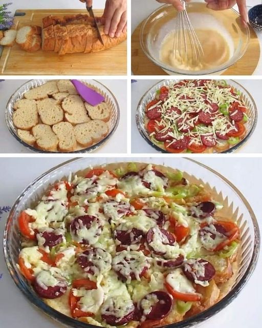 Eine leckere und einfach zuzubereitende Brotpizza 😋 8-10 Scheiben Brot Für die Soße: 2 Eier 1 Glas Milch 1 Esslöffel Mehl 2 Löffel Joghurt 3 Esslöffel Sonnenblumenöl Salz Für die Spitze; 1 Tasse Cheddar Ein halbes Wurstbrötchen Eine halbe Tasse Mais 1 kleine Tomate 1 kleine grüne Paprika 4-5 schwarze Oliven 4-5 grüne Oliven Vorbereitung: … Lire plus
