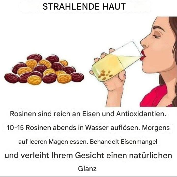 Trinken Sie morgens das Wasser auf nüchternen Magen und essen Sie die eingeweichten Rosinen.