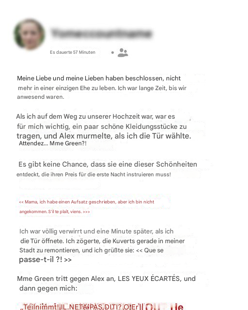 Dann hörte man das Geräusch der knarrenden Tür. Meine Schwiegermutter, Mrs. Green, trat mit vor Schock erstarrtem Gesicht ein.