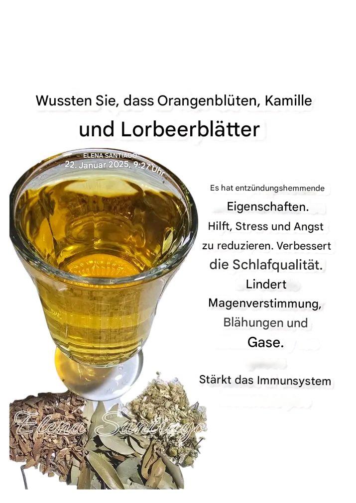 Orangenblüten sind für ihre beruhigende Wirkung und ihre Fähigkeit bekannt, Angstzustände zu reduzieren. Ihr Aroma und ihre Zusammensetzung entspannen das Nervensystem und fördern erholsamen Schlaf. Kamille wird ebenfalls häufig verwendet, um den Geist zu beruhigen, Spannungen abzubauen und tiefe Ruhe zu fördern. Bei Schlaflosigkeit oder Alltagsstress kann ein Aufguss dieser Kräuter ein sehr wirksames natürliches Heilmittel sein.