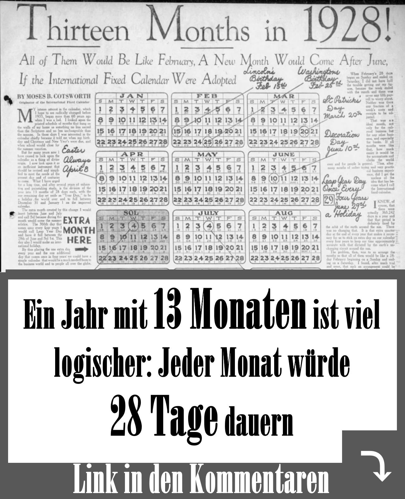 Darüber hinaus ergibt 13 × 28 genau 364 Tage, was der Länge eines Sonnenjahres von 365,24 Tagen sehr nahekommt. Der verbleibende Tag (oder zwei in Schaltjahren) könnte als “Jahrestag” oder ein außerhalb der Wochenstruktur stehender Feiertag eingeführt werden, ähnlich wie im “International Fixed Calendar” oder im “Positivistischen Kalender” von Auguste Comte vorgeschlagen.