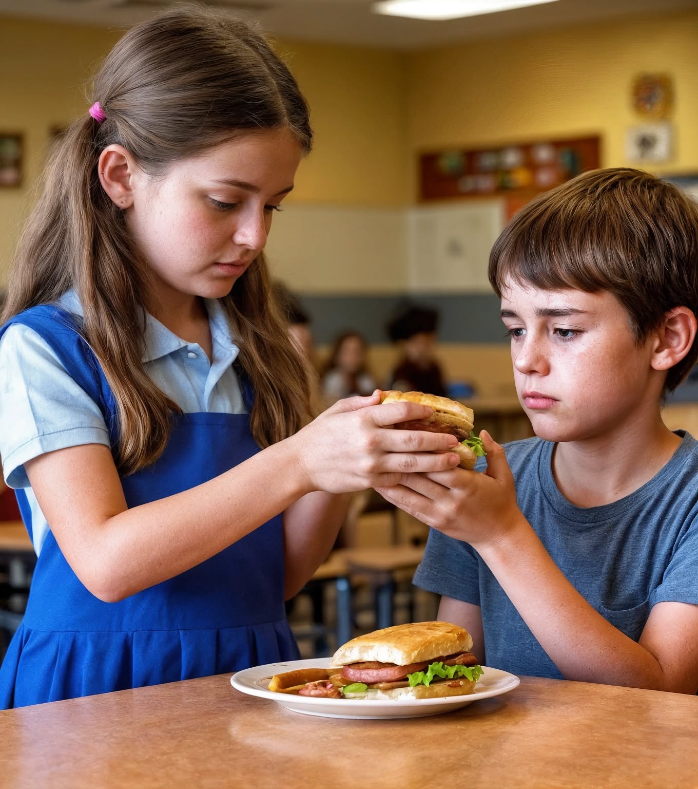 In den belebten Gängen der Grundschule, inmitten des Lachens der Kinder und der verlockenden Gerüche der Cafeteria, bemerkte Lilia, ein lebhaftes und aufmerksames Mädchen, oft, was andere übersahen. Als sie an jenem Tag die lärmende Kantine betrat, fiel ihr Blick auf eine stillere Ecke: An einem leeren Tisch kritzelte ein einsamer Junge mit niedergeschlagenen Augen in ein altes Notizbuch.