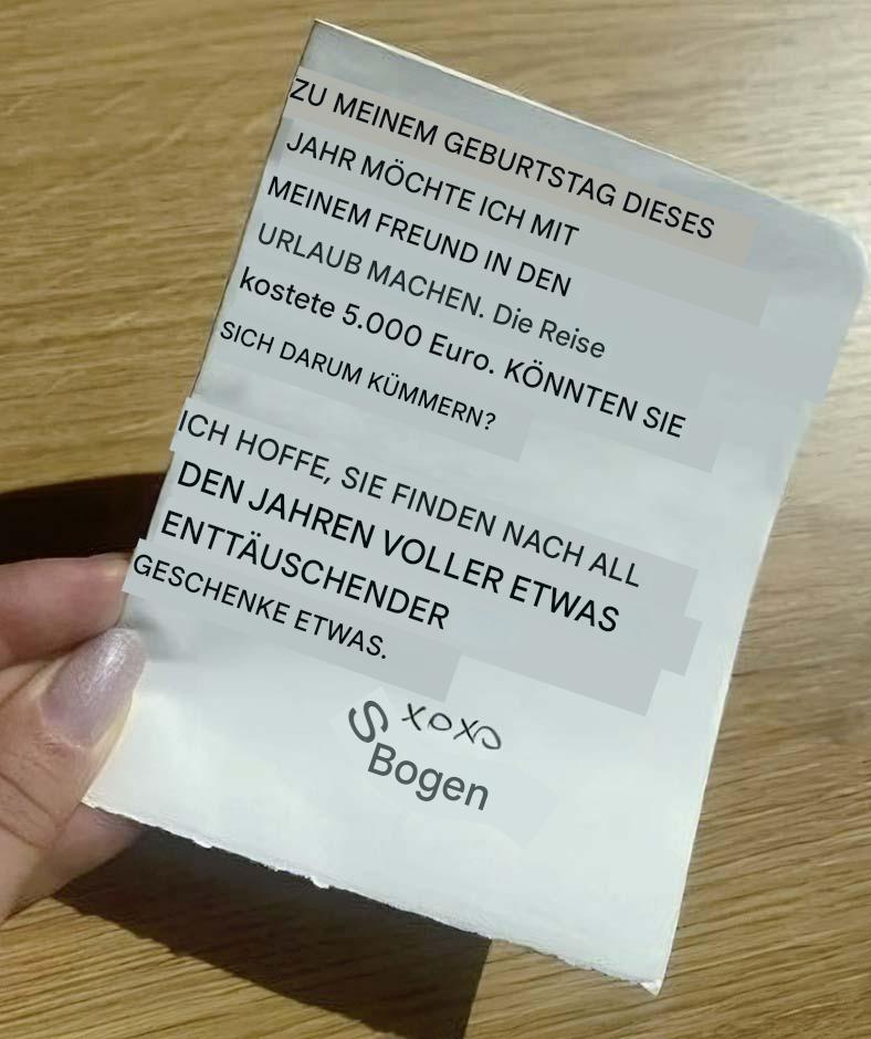 In dem Schreiben, das eine Schätzung von 5.000 Euro enthielt, wurde um Geld für den Urlaub im Zusammenhang mit der Hochzeit gebeten. Der Brief wurde von einer scharfen Bemerkung begleitet: « Ich hoffe, dass Sie nach all den Jahren billiger Geschenke genug gespart haben. »