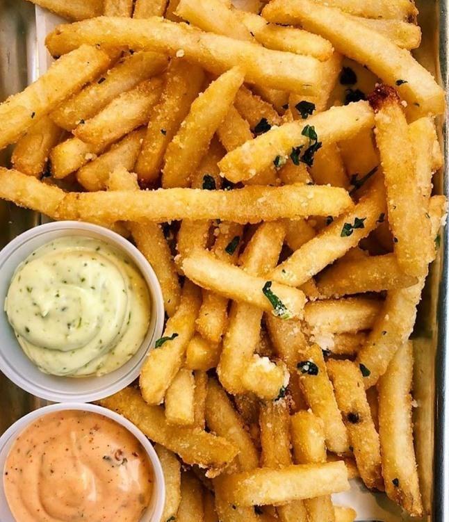 4 große Pommes Frites, Pelées und Coupées in Bâtonnets, 2 Cuillères mit Olivenhuhnsuppe, 3 Gousses d’ail, Hachées Finement, 1/2 Tasse geriebenem Parmesan, 1 Cuillère mit Café de Paprika, Sel und Poivre au Goût Persil frais, haché (pour la garniture)