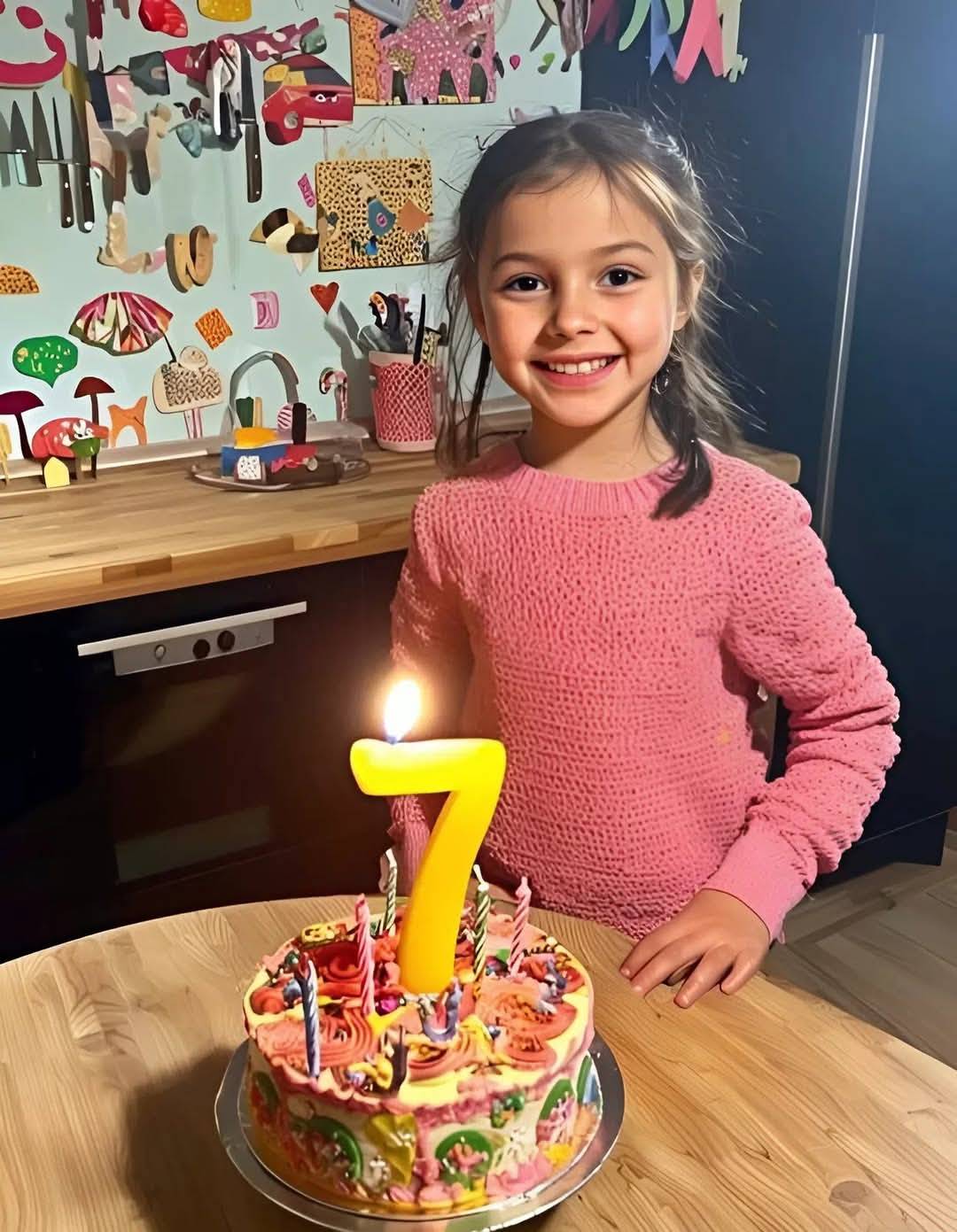 Heute bin ich 7 Jahre alt. Meine Großmutter hat mich aufgezogen, seit ich ein Kind war, und sie hat diesen Kuchen mit ihren eigenen Händen gebacken. Ich bin sehr dankbar für ihre Liebe und Fürsorge.