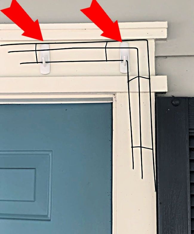 Befestigen Sie zwei Befehlshaken an der Zarge um Ihre Tür, so dass die Hälfte des Rahmens an die Kante der Tür passt, wie oben gezeigt. Nachdem du deine Haken angebracht hast, nimm den Draht wieder nach unten, damit du deine Dekoration machen kannst.