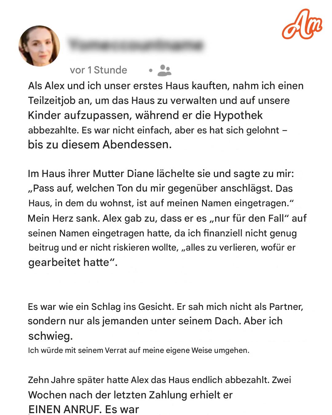 Als Alex und ich vor ein paar Jahren unser erstes Haus kauften, war ich überglücklich. Es war ein bescheidenes Haus mit drei Schlafzimmern in einer ruhigen Gegend, der perfekte Ort für unsere Kinder, um aufzuwachsen. Sicher, die Hypothek war hoch, aber wir haben es geschafft. Alex arbeitete Vollzeit und ich hatte einen Teilzeitjob, der es mir ermöglichte, mich um die Kinder und den Haushalt zu kümmern.