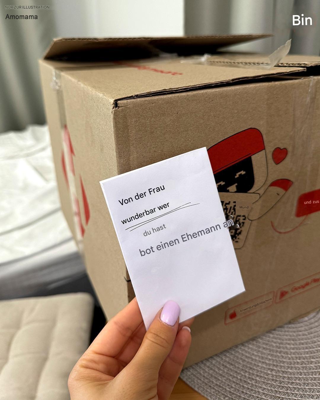 « Wer zum Teufel…? », flüsterte ich fassungslos vor mich hin, als ich dem Zusteller half, die Schachtel hineinzulegen. Mark kam neugierig herein.