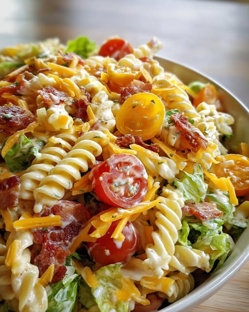 NUDELSALAT MIT RANCH, SPECK, TOMATEN UND CHEDDAR