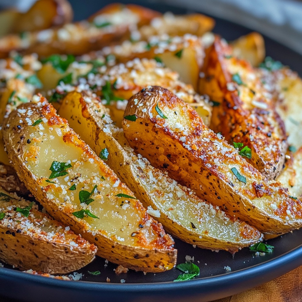 « Ofengebackene Knoblauch-Parmesan-Kartoffelspalten ».