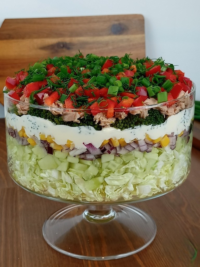Das ist der Salat, den ich kürzlich für eine Familienfeier zubereitet habe. Der Salat war im Nu verschwunden, also denke ich, dass ich beim nächsten Mal zwei Portionen😉 zubereiten werde. Ich empfehle es, es ist lecker und beeindruckt bei den Gästen.