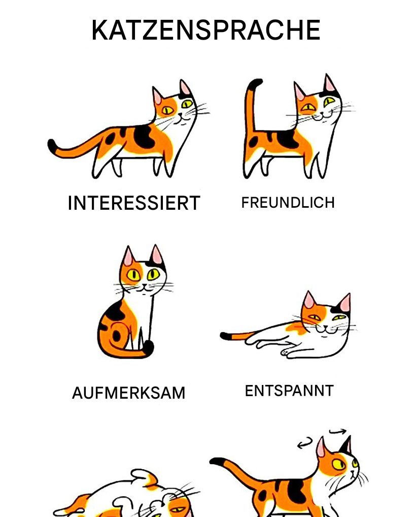 Schwanzzucken: Gelegentliches Schwanzzucken deutet darauf hin, dass Ihre Katze aufgeregt oder ängstlich ist. Häufigeres Schwanzzucken kann ein Zeichen für Stress oder Schmerzen sein. In diesem Fall ist ein Besuch beim Tierarzt ratsam.