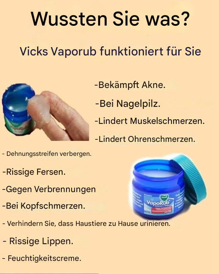 Vicks VapoRub ist eine Menthol-Salbe, die für ihre Wirksamkeit bei verstopfter Nase und Erkältungssymptomen bekannt ist. Dieses Produkt ist jedoch auch ein beliebtes Hausmittel zur Behandlung von Gelenk- und Muskelschmerzen sowie Entzündungen in verschiedenen Körperteilen, wie Rücken und Knien. Dank ihrer Wirkstoffkombination bietet diese Salbe schnelle, natürliche Linderung ohne Nebenwirkungen.