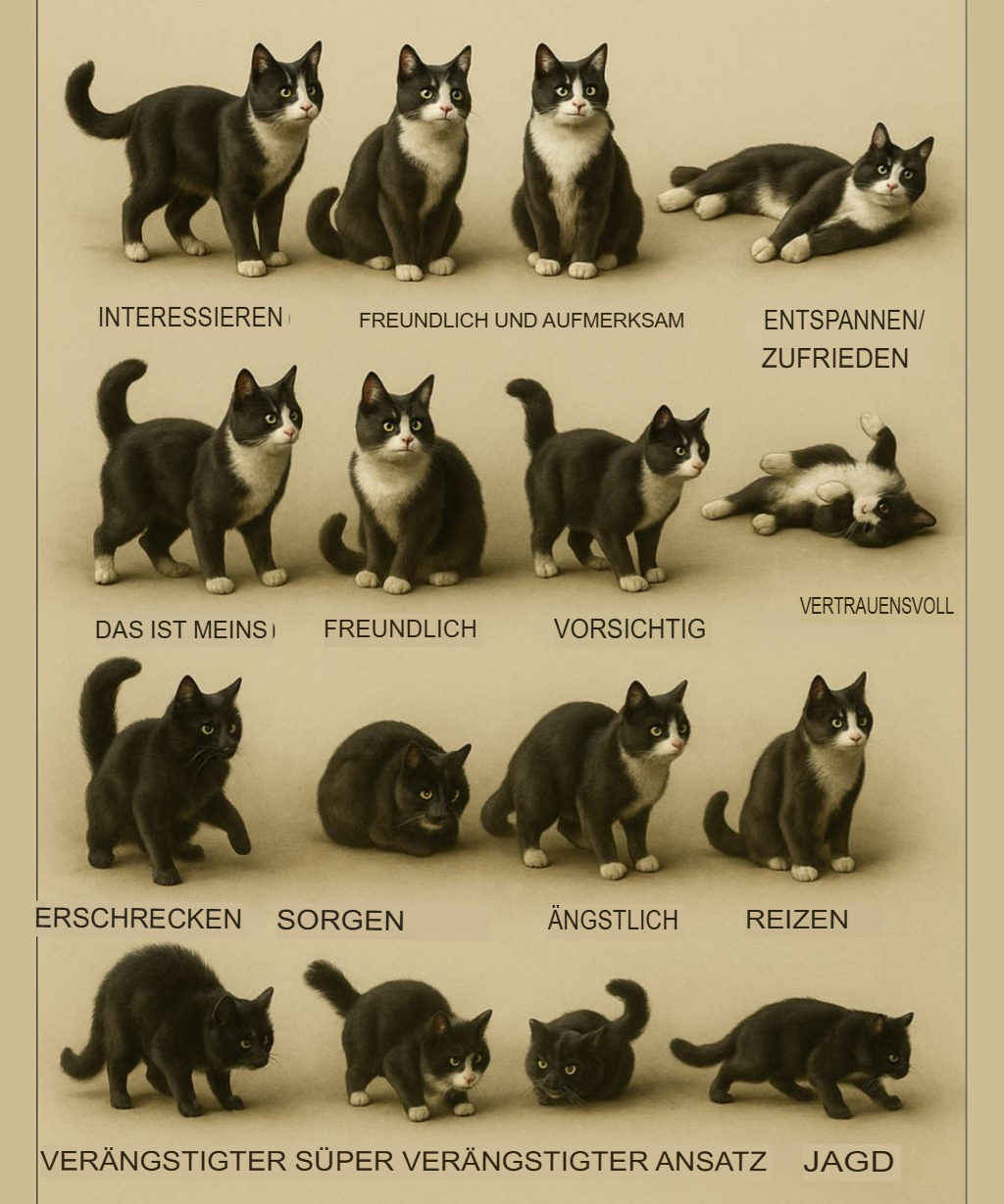 Katzen sprechen vielleicht nicht unsere Sprache, aber sie kommunizieren definitiv – mit ihrem Körper! Dieser visuelle Leitfaden zeigt 16 gängige Katzenemotionen, die sich durch Körperhaltung, Schwanzhaltung, Ohren und Augen ausdrücken.