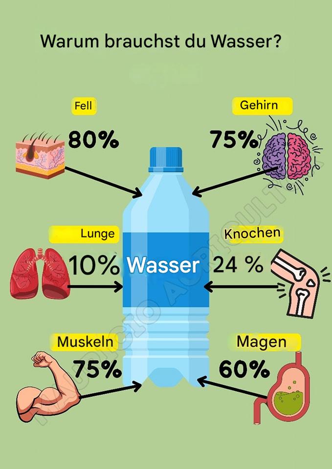 Der menschliche Körper besteht zu etwa 60 % aus Wasser, wobei dieser Anteil je nach Alter, Geschlecht und körperlicher Verfassung variiert. Wasser ist für das reibungslose Funktionieren des Körpers unerlässlich, da es an zahlreichen lebenswichtigen Prozessen wie Temperaturregulierung, Verdauung, Blutkreislauf und Abfallbeseitigung beteiligt ist.